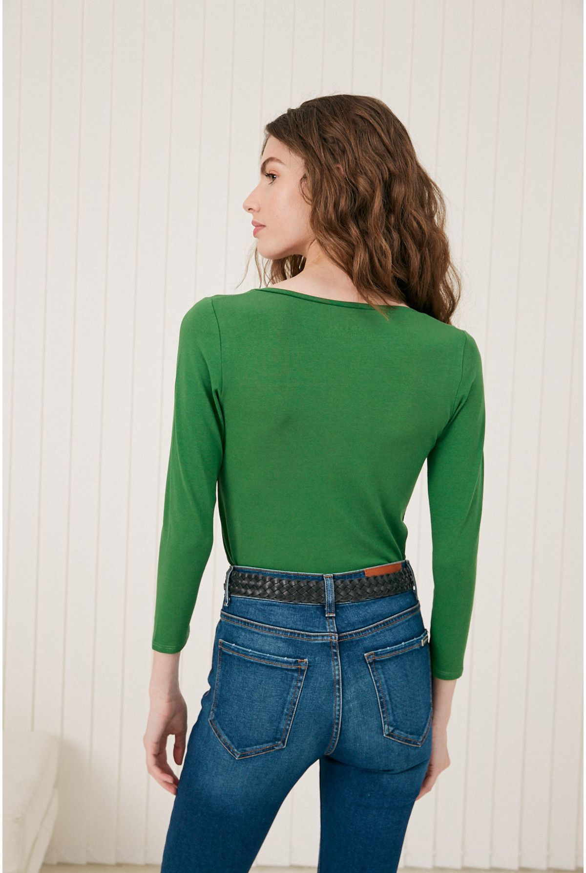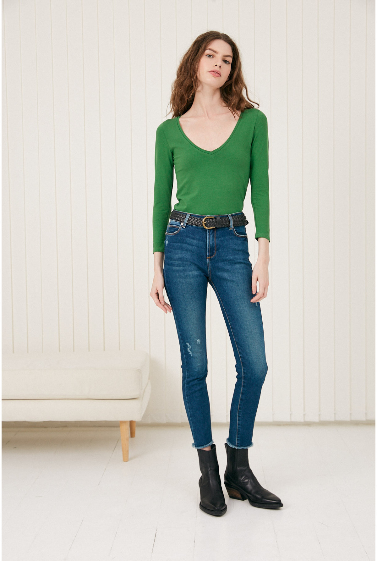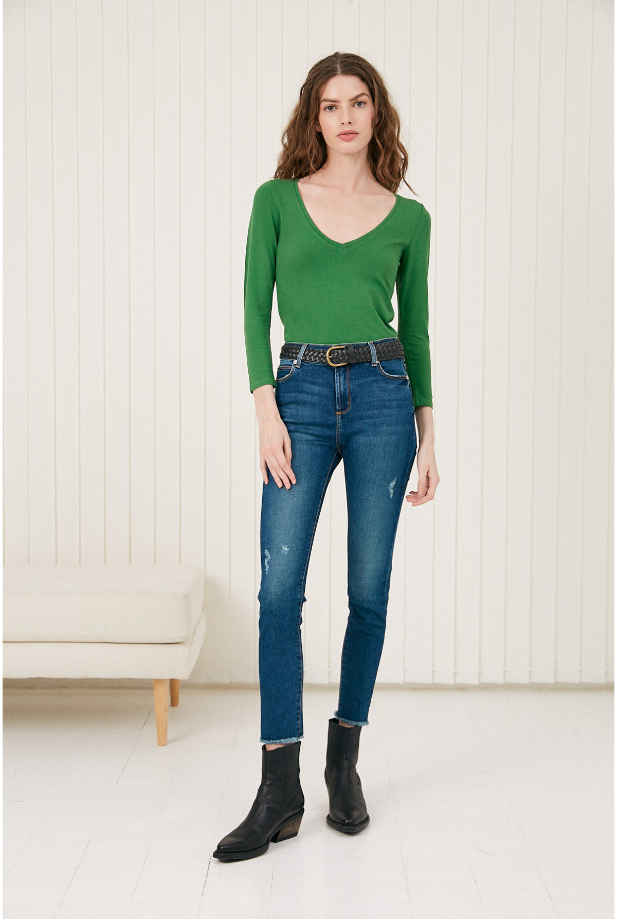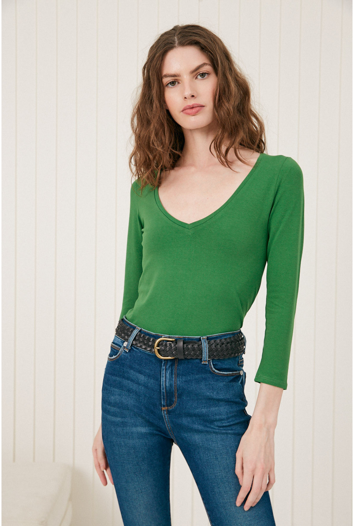 Remera escote V con manga 3/4. Calce fit.