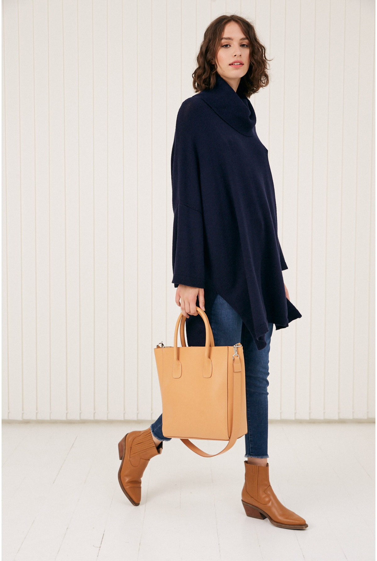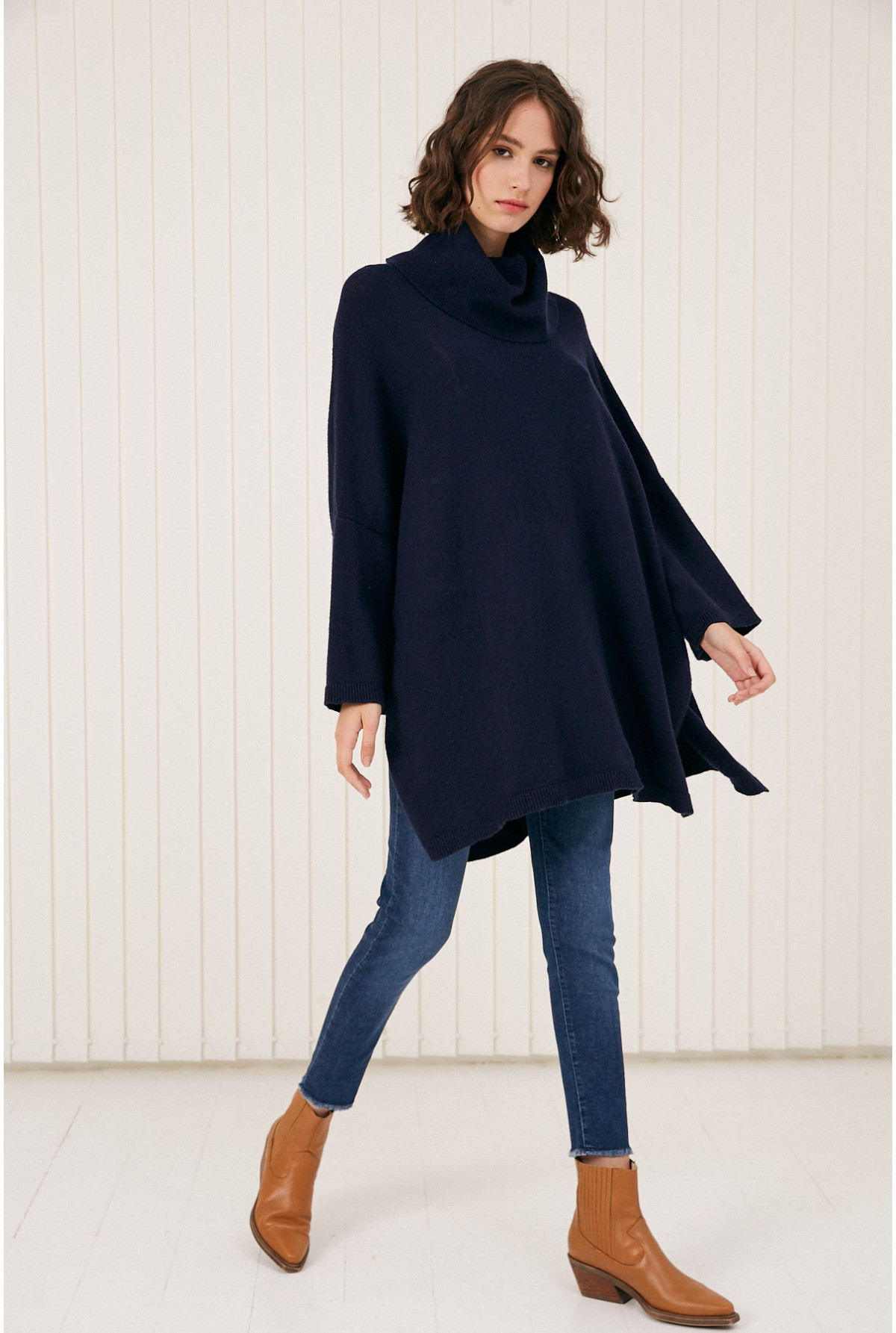 Polerón largo con manga recta y tajos laterales. Calce amplio.